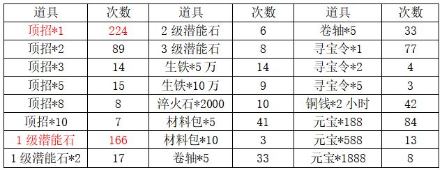 根据以上数据可看出,顶级招募令获得概率最高,接近25%,其次为1级随机潜能石,接近18.5%;