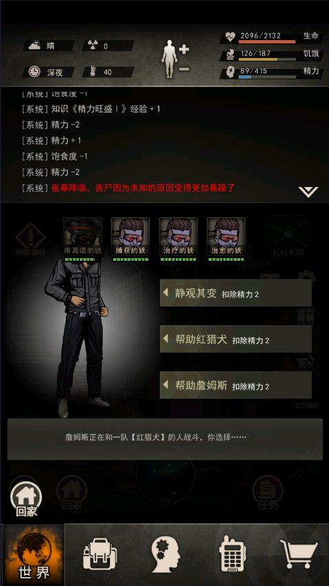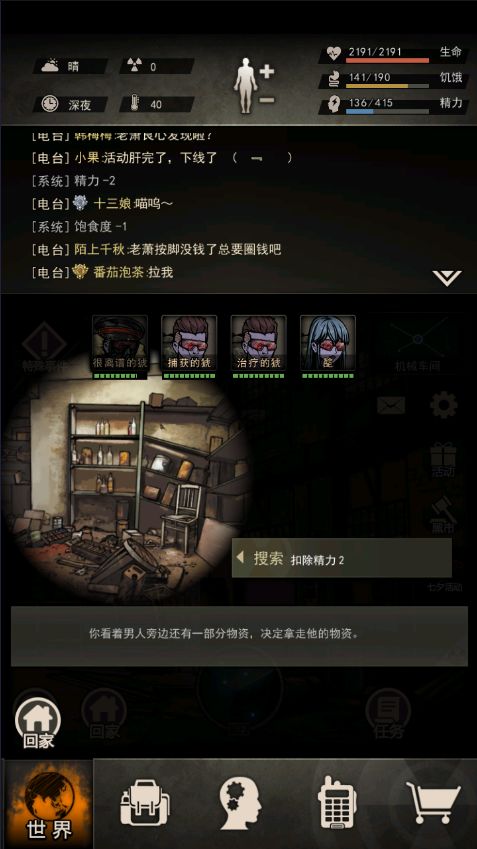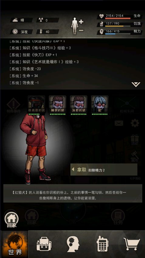 选择静观其变,拿取,获得:可乐2,机械零件3,肉干20