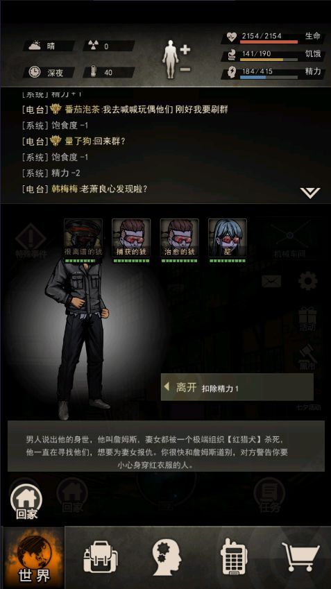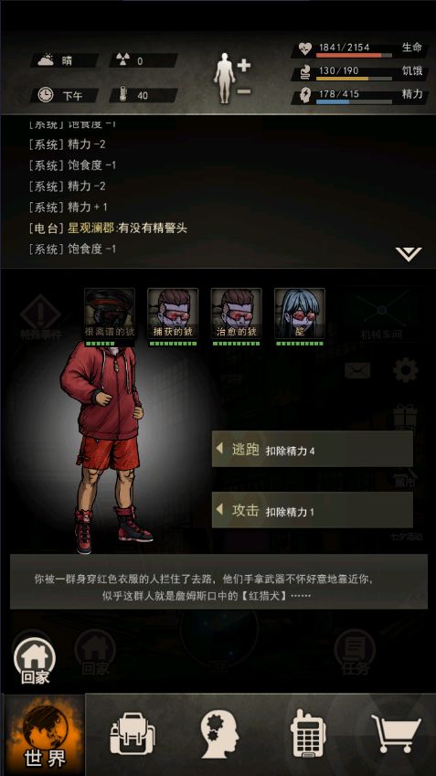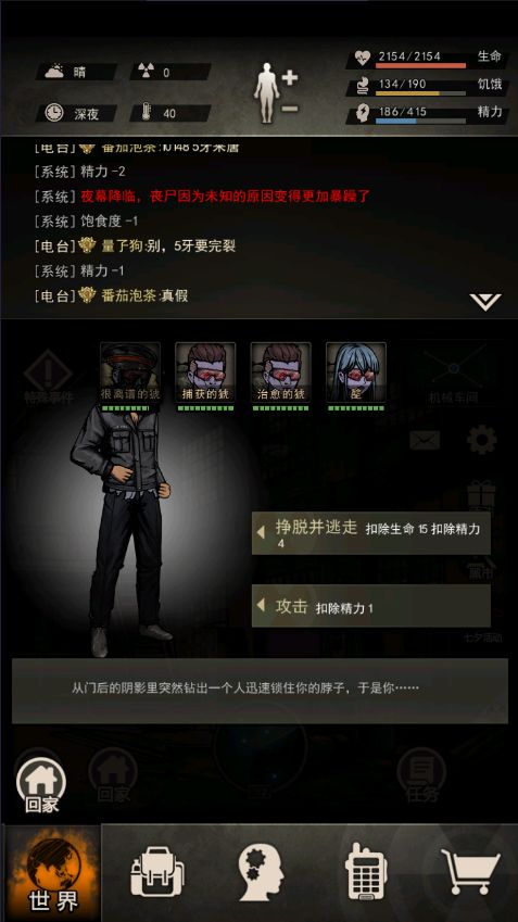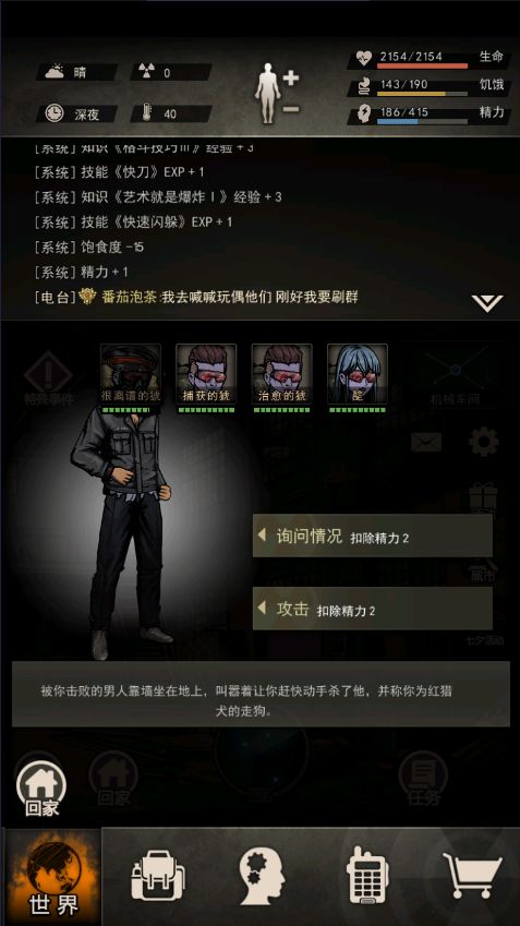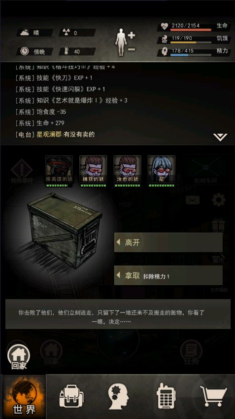 选择攻击(实际不打),获得:可乐3,机械零件5,肉干15