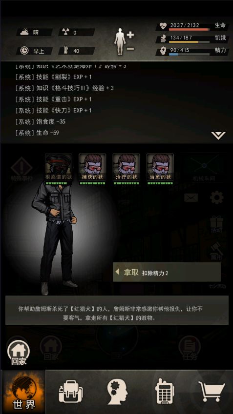 选择帮助红猎犬,拿取,获得:可乐2,机械零件3,肉干5
