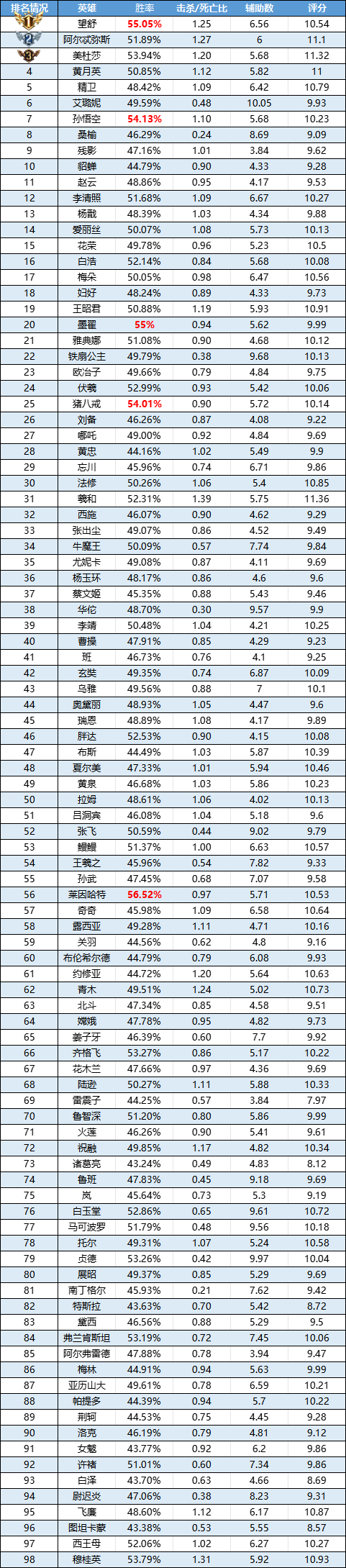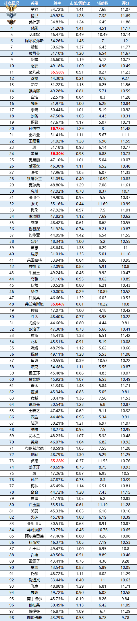 排序:榜单按出场率由高到低排序,标红胜率前5。