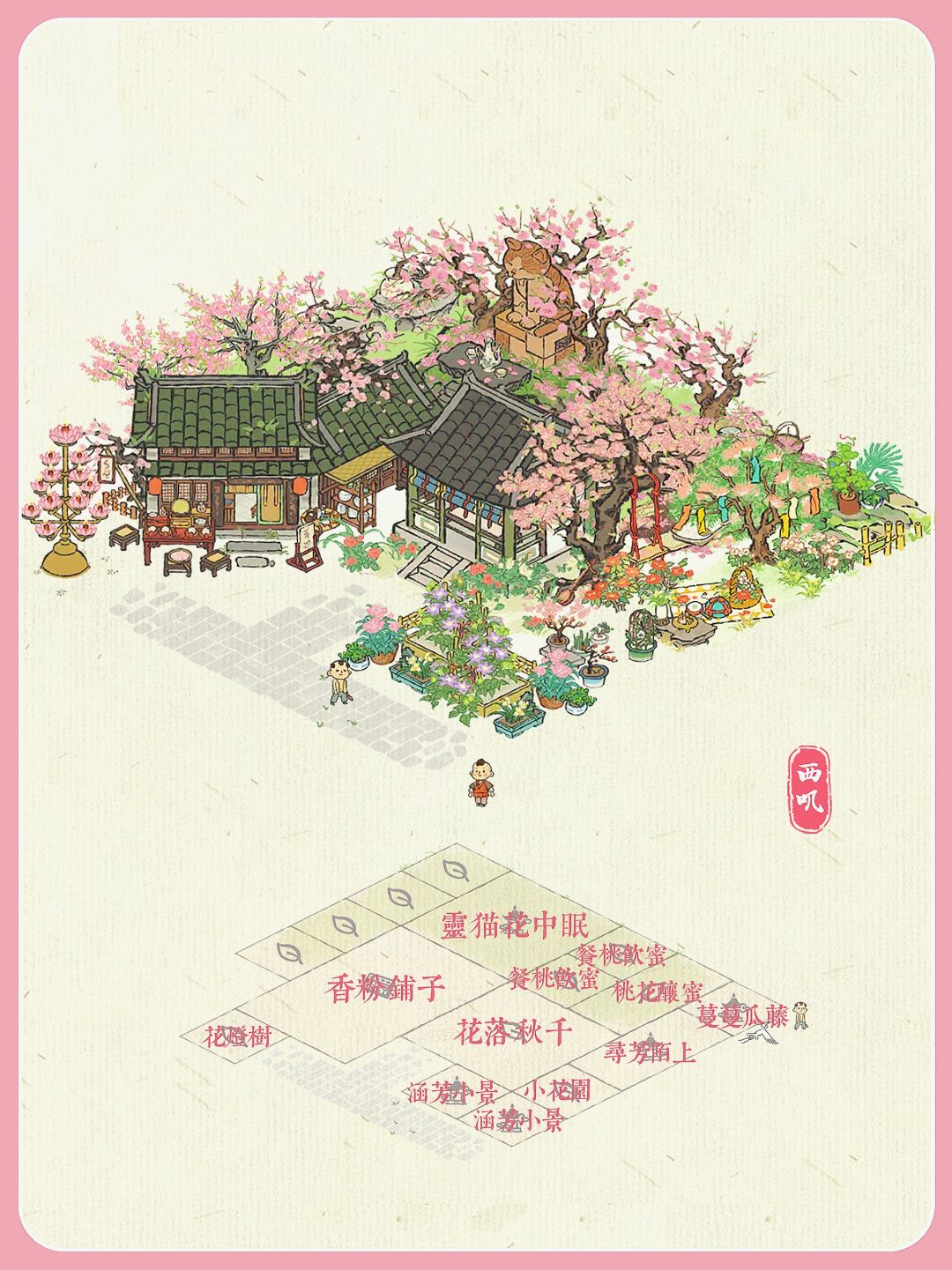 建筑:香粉铺子,落花秋千,灵猫花中眠,餐桃饮蜜,桃花春风,桃花酿蜜,涵芳小景,蔓蔓瓜藤,小花园,寻芳陌上
