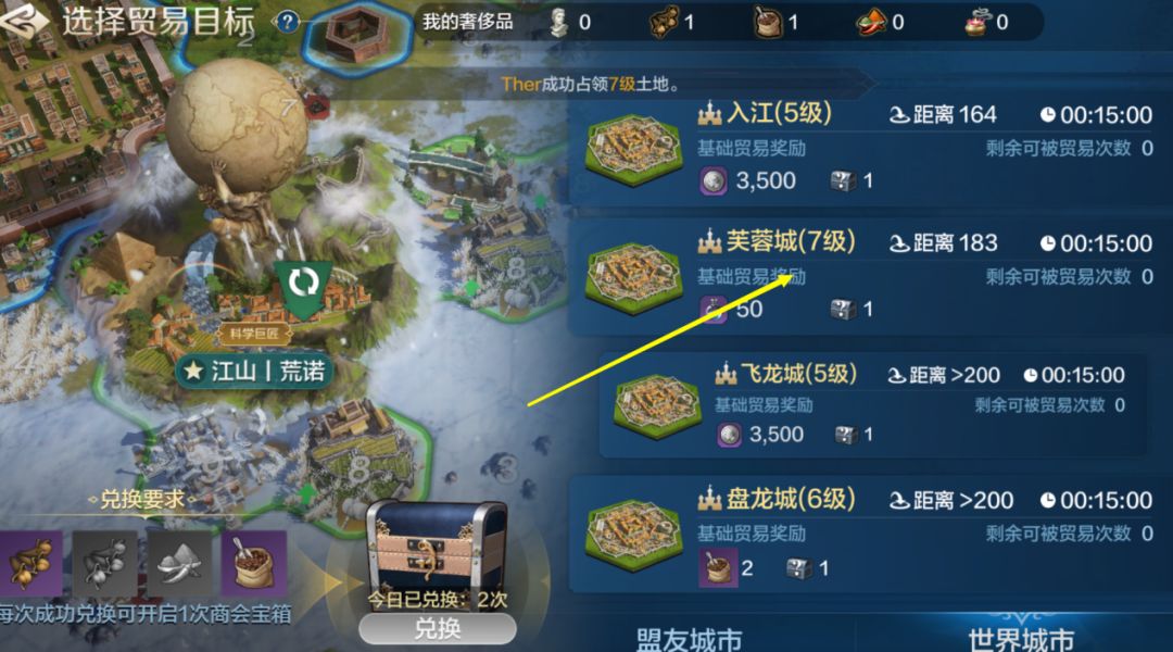 一些获得科技点的地方,所有商店能买科技点的地方一定要拿完,需要注意的是,当开7级城后,主城贸易可以跟世界城市科技城进行贸易,一次给50科技点,我们可以通过提升主城银行的等级,提高这个科技值的数量,一般我们只需要升主城的银行等级既可以,因为世界城市贸易只有3次,拿满就可以。