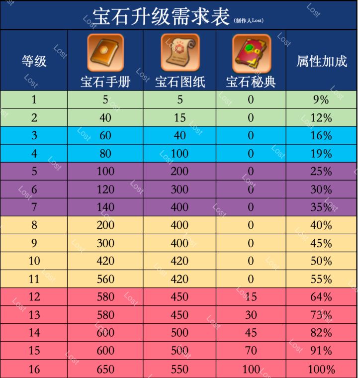 宝石升级需求表,1~16级,秘典需要先11之后才会出现对应礼包