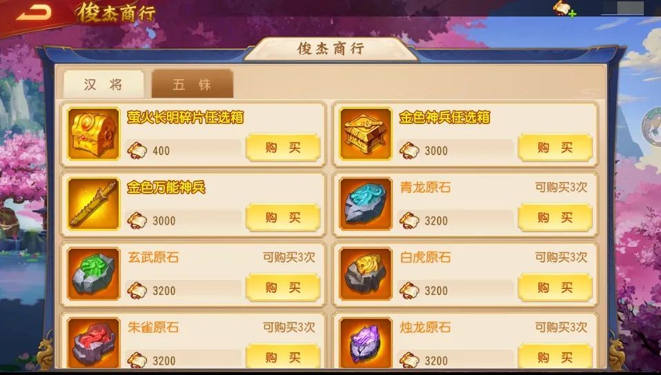 3、主公获得的「五铢钱」可以在五铢商店中兑换你想要的物品哦,原石、礼记周易、将星、洗练石、鲛油长明灯、北斗司南、金色万能神兵等海量道具和资源统统都有。