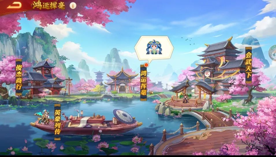 活动开启后,主公可在主界面右上角点击进入活动,可以参与「鸿运挥毫」、「俊杰商行」、「会武天下」、「英豪列传」等玩法。