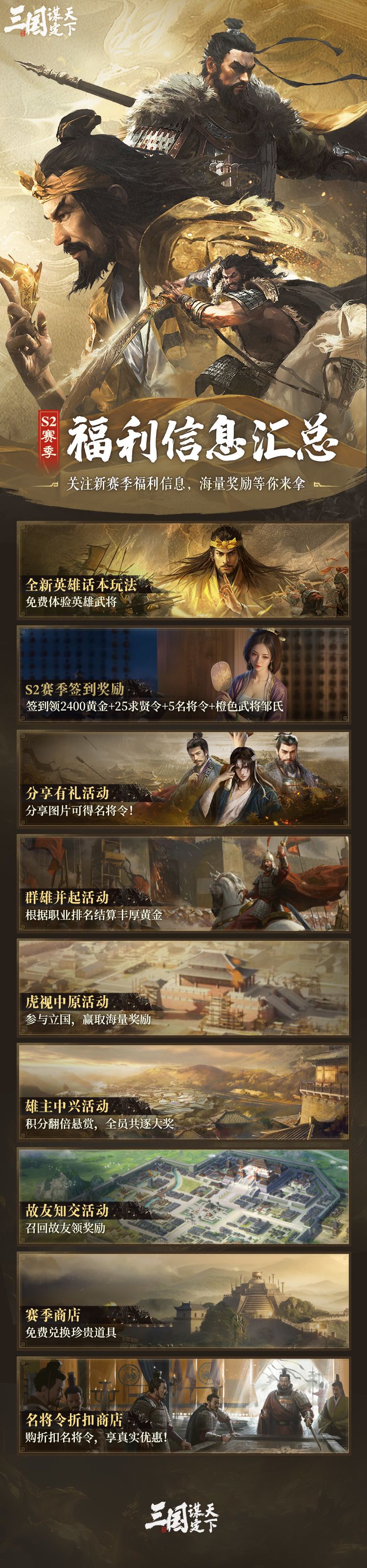在即将到来的S2赛季中,我们新增了:Ⅰ.全新英雄话本玩法:主公可以在限时开启的每个话本中免费选取一名强力的“英”武将加入武将库,已选择的英雄武将每隔48小时可自行选择更换,最终英雄武将的体验时间将长达一整个赛季;Ⅱ.全新赛季签到奖励:参与首月签到累计可获2400黄金、25枚求贤令、5枚名将令、橙色武将邹氏等丰厚奖励;Ⅲ.分享有礼:参与活动,分享即可获得名将令奖励。Ⅳ.故友知交:分享个人专属邀请码,邀请好友回归,赢黄金奖励;Ⅴ.赛季商店:使用荣誉点,兑换特技&特效卷轴、求贤令等珍贵道具;Ⅵ.名将令折扣商店:消耗玉石购买折扣名将令,体验与首充双倍一致的优惠福利!
