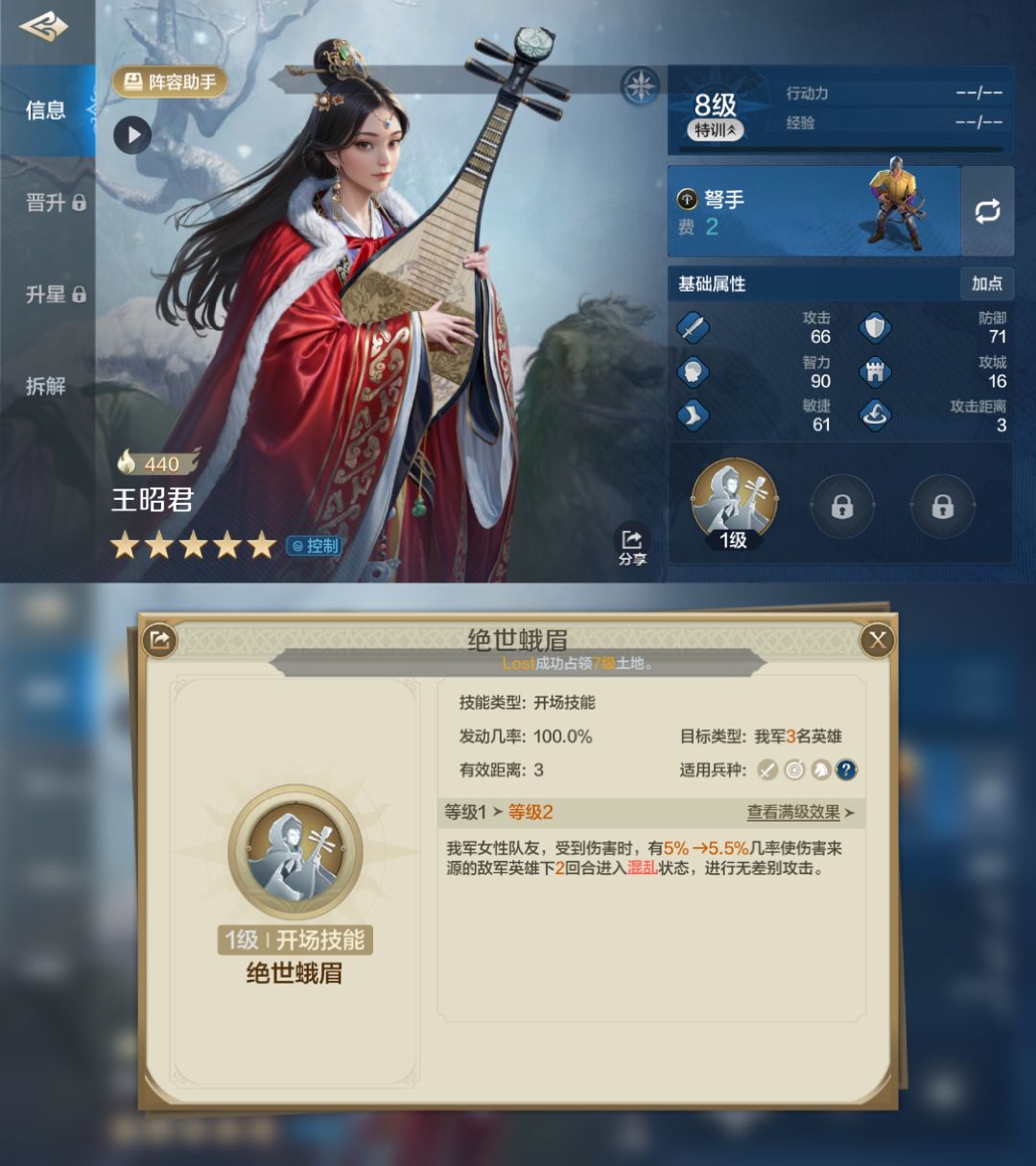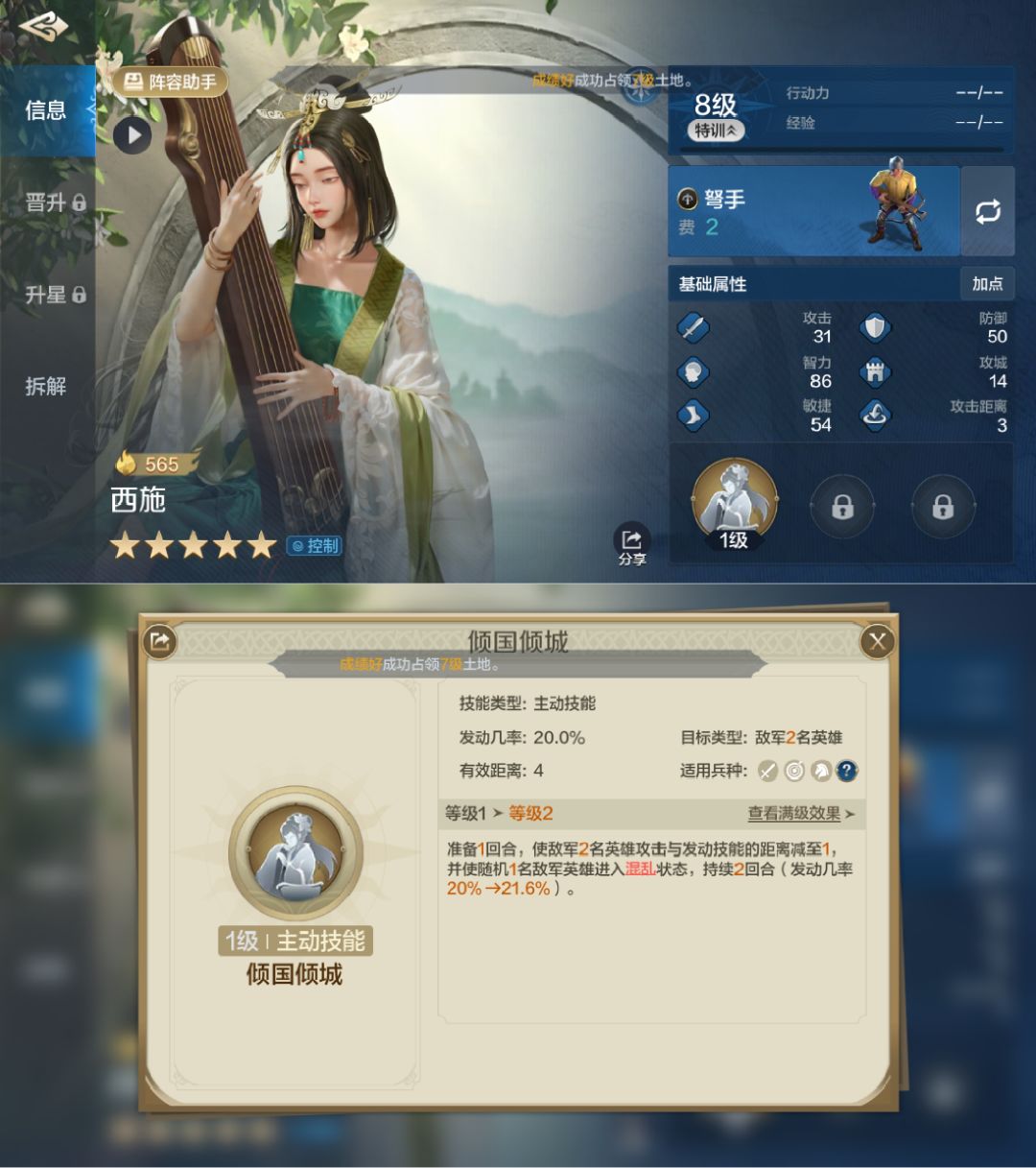 专属技能【倾国倾城】:准备1回合,使敌军2名单位攻击与发动技能的距离减至1 并使随机1名敌军单位进入混乱状态,持续2回合(发动几率20%→35%)。