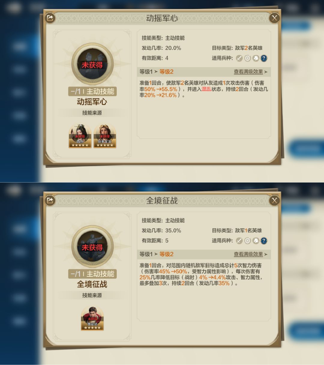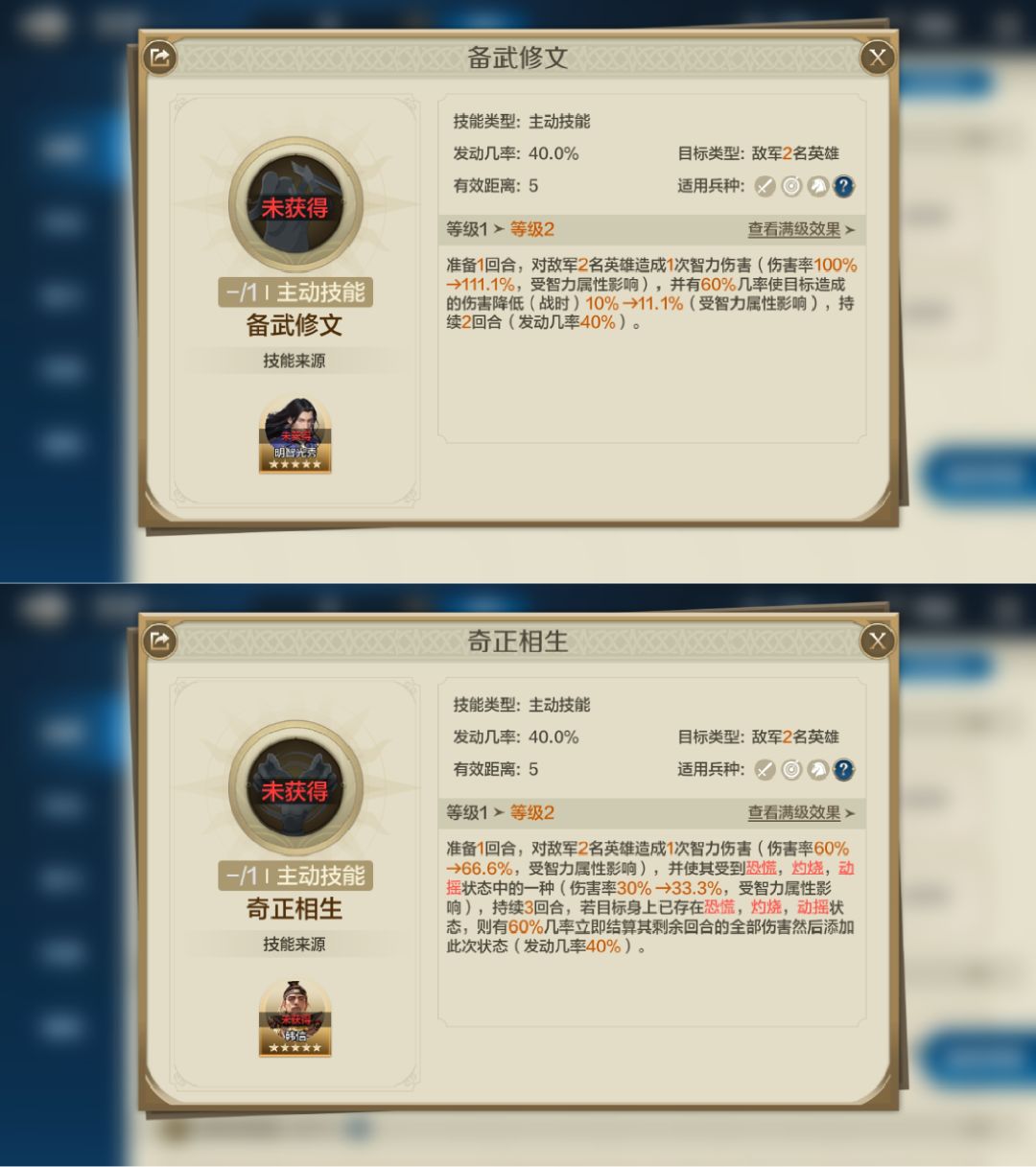 专属技能【兵权谋】:战斗开始后前3回合,使敌军2名英雄处于控制状态(缴械, 沉默,混乱,眩晕,嘲讽、力竭)时受到的伤害提升(开 场)5%→>10%受智力属性影响),且从第3回合起陷入混乱状态(不可驱散),持续2回合。