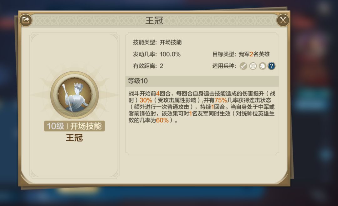 经测试,腓特烈一世能为关羽带来70%的增伤,也就是触发两次增益增伤机制。腓特烈一世的自带技能表述主要如下: