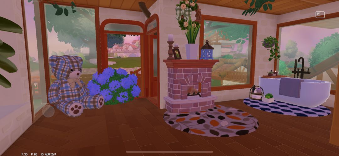 图 7️⃣床对面的视角,这个壁炉真的大爱!可以互动生火🔥,就是光太亮,所以熄火截图的。