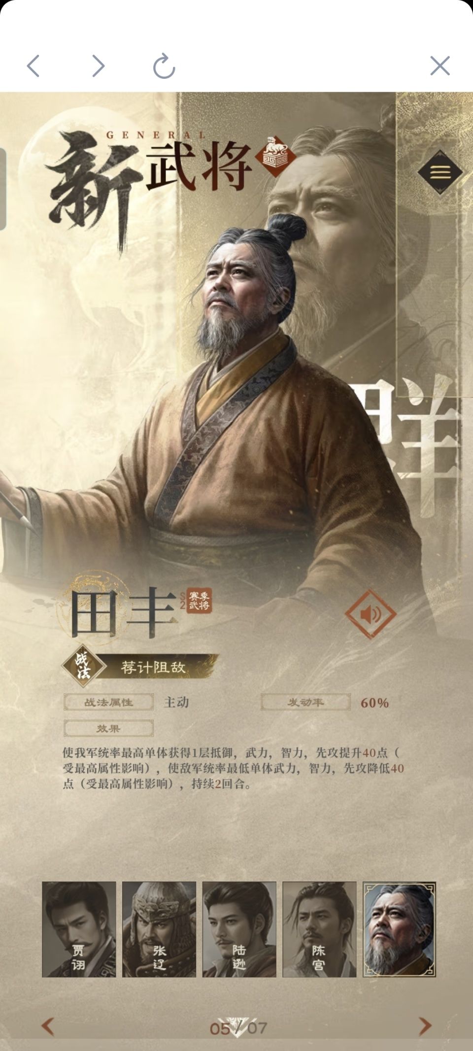 旧的不去,新的不来,随着三国谋定天下S1赛季接近尾声,令人期待的S2赛季也将进行无缝接档!从官方目前放出的消息来看,已经确定有7个橙色级别的名将会在S2赛季与广大玩家们见面,并正式投入到新一轮群雄争霸的战斗之中。故而本人就想自己做一起期待值的排名,以下仅为个人观点,不知能否契合大众。第七名,田丰。