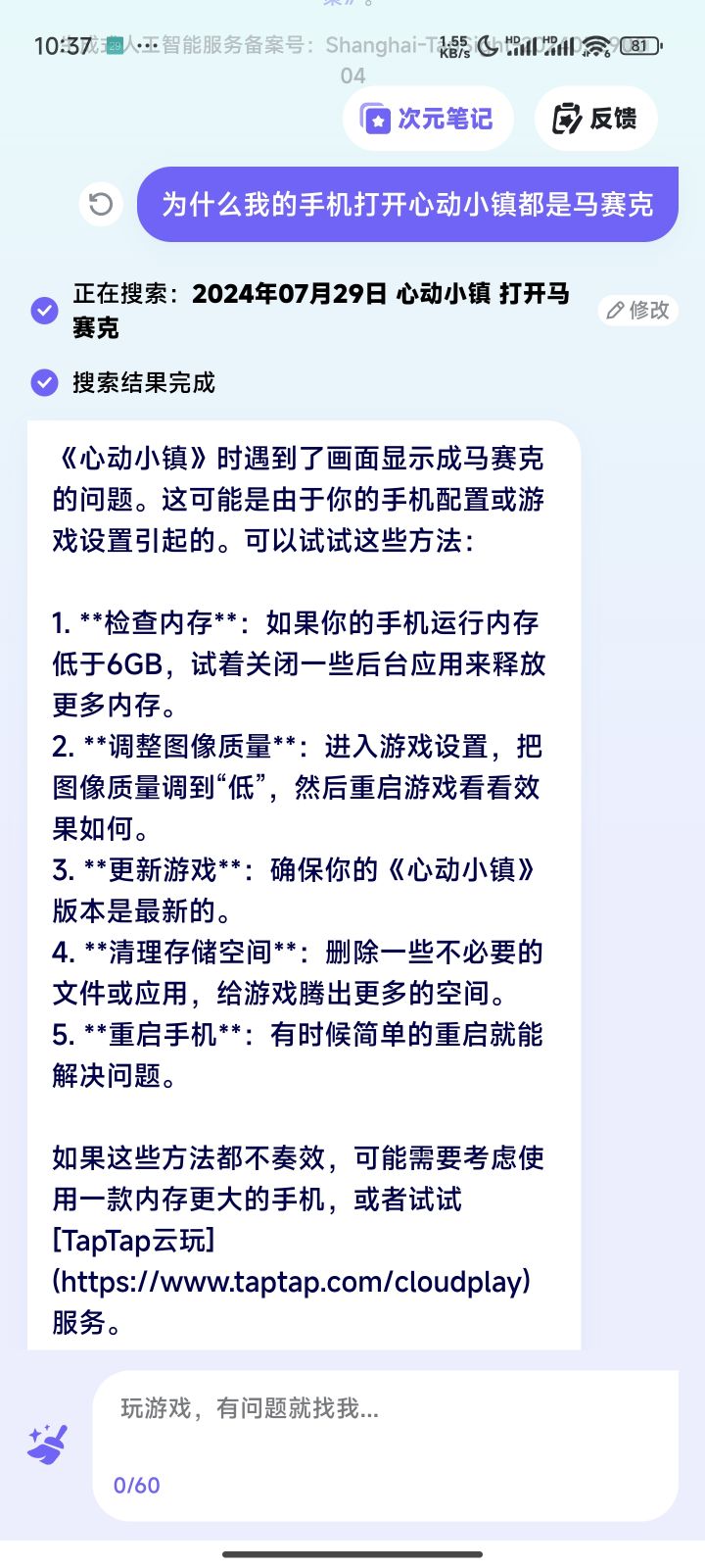 3.如果还不行只能尝试更换大运存手机或者使用TapTap云玩。
