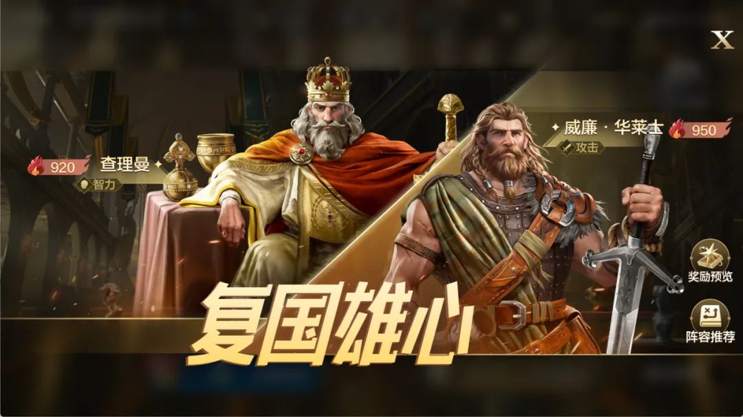 本期主题为查理曼和威廉·华菜士,欧陆上的著名军事家,政治家。一位是加洛林王朝国王,查理曼帝国建立者,伟大的军事家,政治家。一位是带领苏格兰人抗击英格兰侵略者的民族英雄。这两位英雄总结都是适合中速队伍组队,围绕贞德进行搭配。