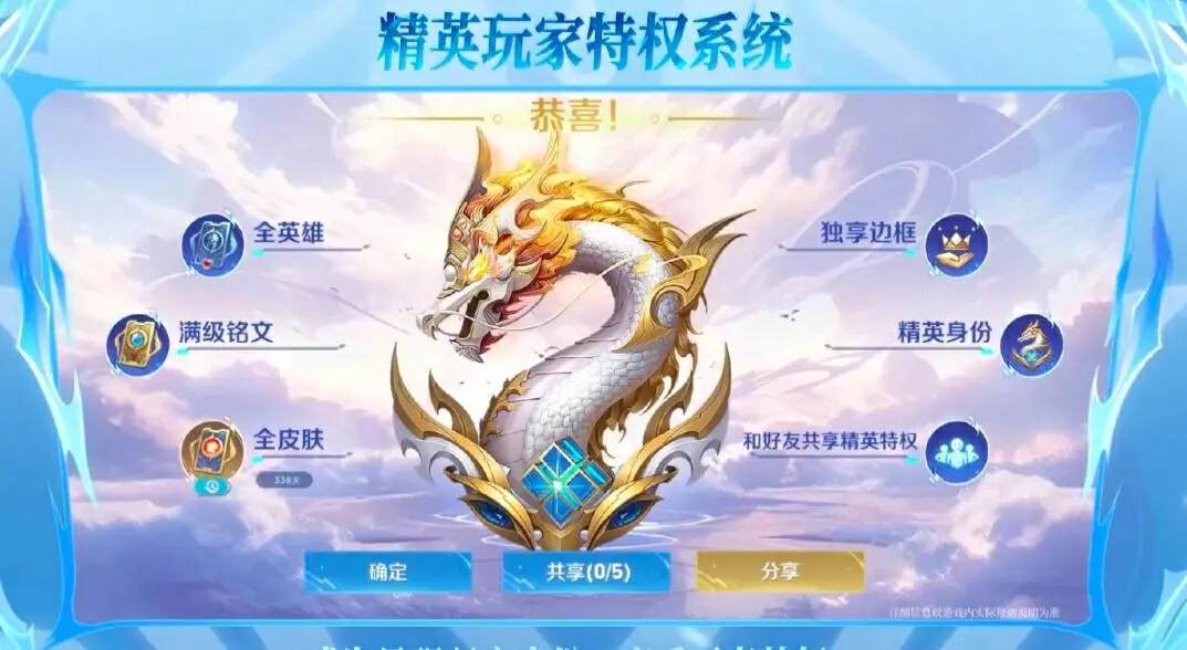 最重要的特权就是免费使用全皮肤,这个特权可谓是非常非常有含金量了,在国服,即便是很多荣耀贵族玩家,也不见得有全皮肤,毕竟很多皮肤都非常稀有,但是国际服直接放出了免费体验全皮肤的特权。此外还有独享边框、精英身份等象征身份的标识,再就是共享好友,精英玩家可以把部分特权共享给5个好友,包括使用全英雄、全皮肤以及满级铭文的特权。对比无双贵族荣耀贵族的传承,这个精英玩家的特权共享可谓是完爆贵族传承。贵族传承虽然可以使用皮肤,但是也有时间限制,而且即便是荣耀贵族,也只能传承三位,而精英玩家可以直接共享五位好友。