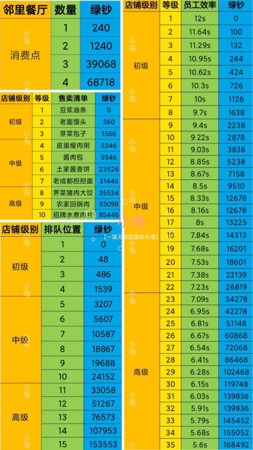租客突然想去餐厅,需要满足他的需求,菜品要不断升级,赢得好评。好评还能额外增加收益。餐厅升级所需绿钞需要多少呢?请看下图: