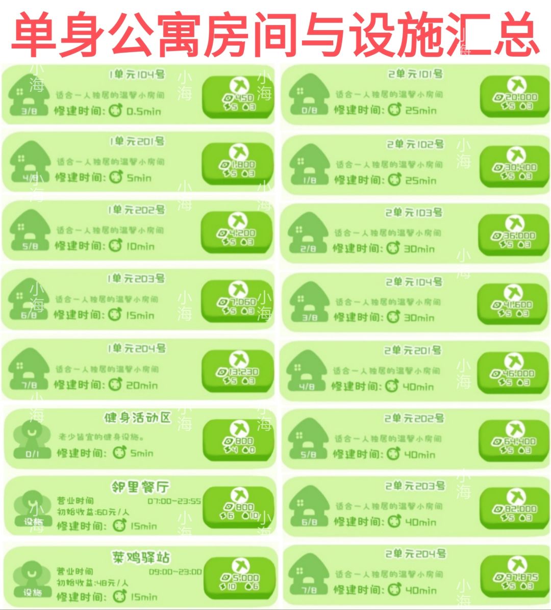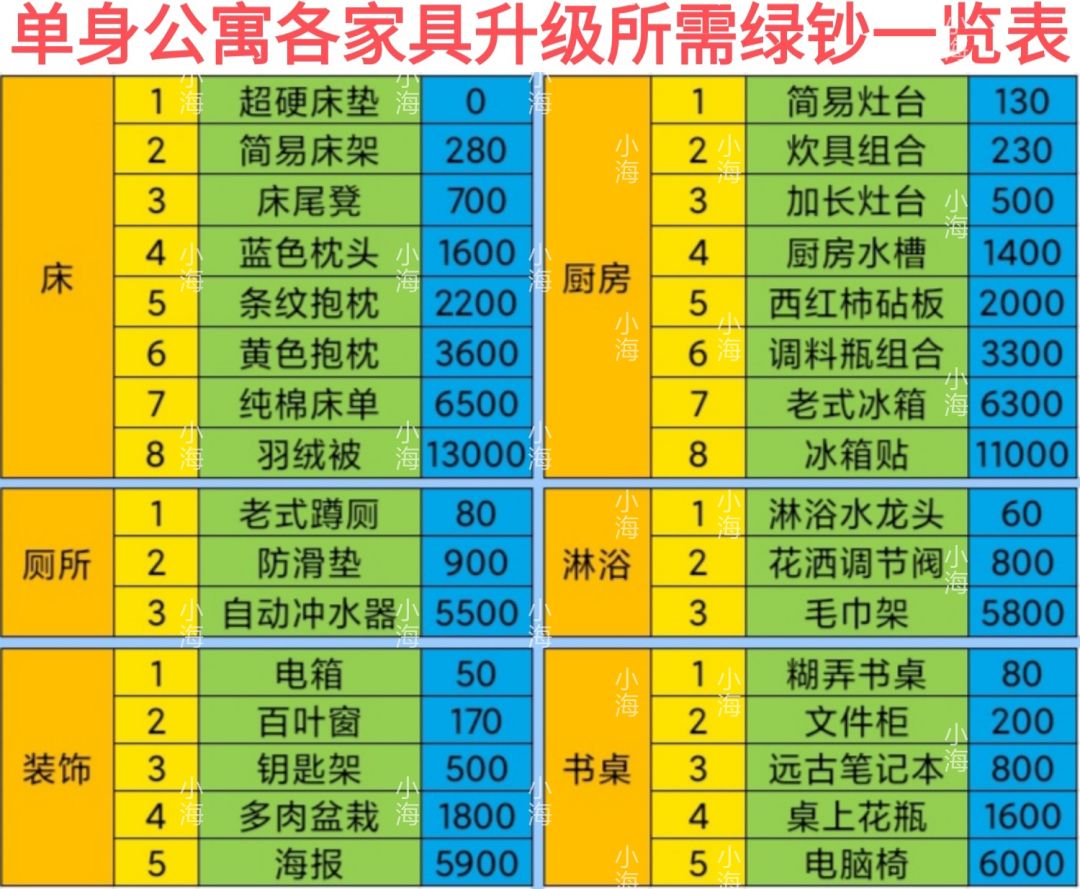 每个房间家具都是一样的,一共有16个房间,需要用绿钞升级家具。详细的家具列表请看下图: