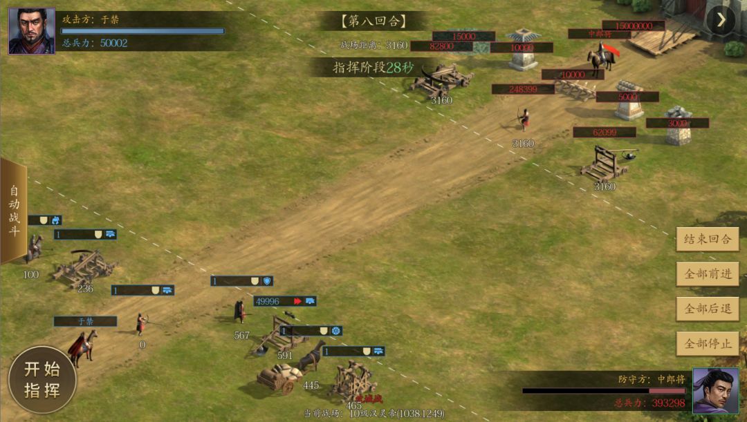 直到清扫完敌方近程兵,开始前进所有兵种并设置我方投石车攻击目标为敌方投石车。当我方投石车击中敌方投石车后,设置我方投石车停止。然后依次进攻敌方床弩、弓箭兵,直到胜利。