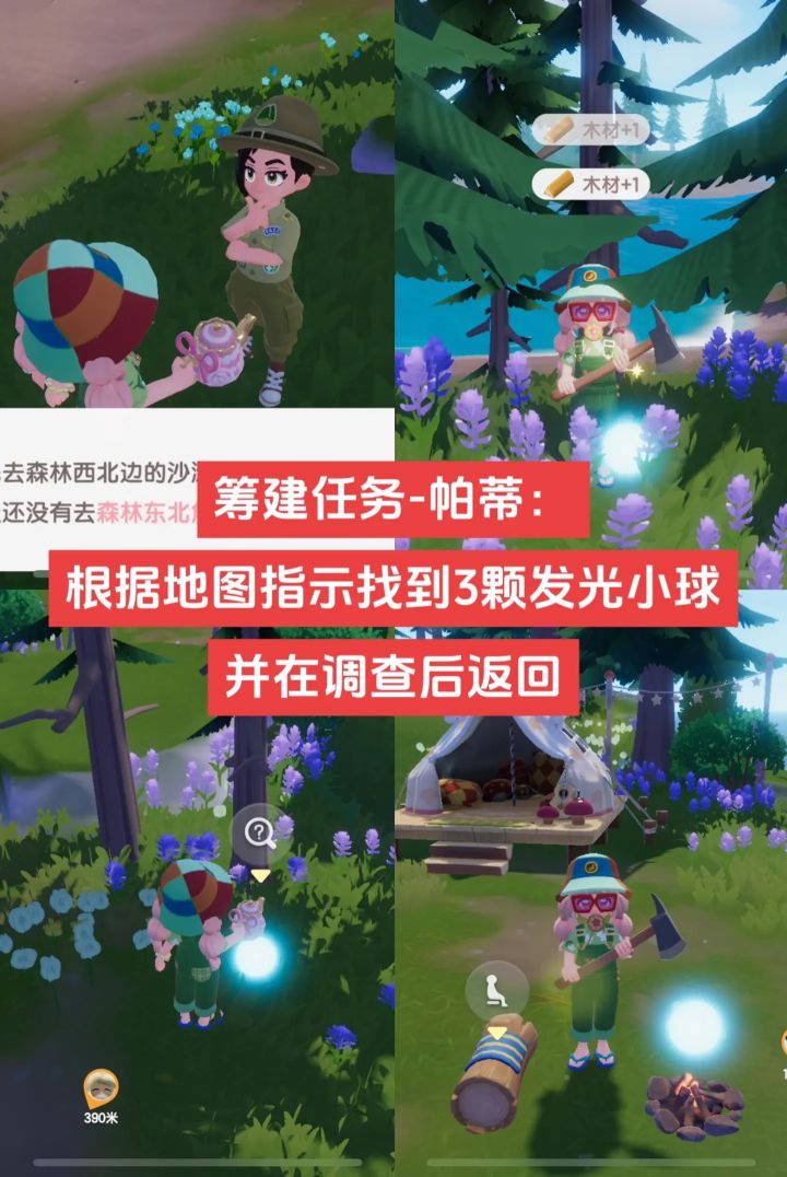 🎾帕蒂:与帕蒂对话后,按地图指引找到图中所示的三颗发光小球并调查,调查后再返回林地寻找帕蒂。(我这里出现bug,只能调查一个小球,不知道会不会被修复)