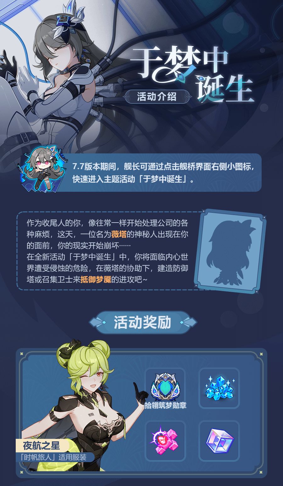 舰长好,7.7版本将开启「于梦中诞生」主题活动。参与活动可获取