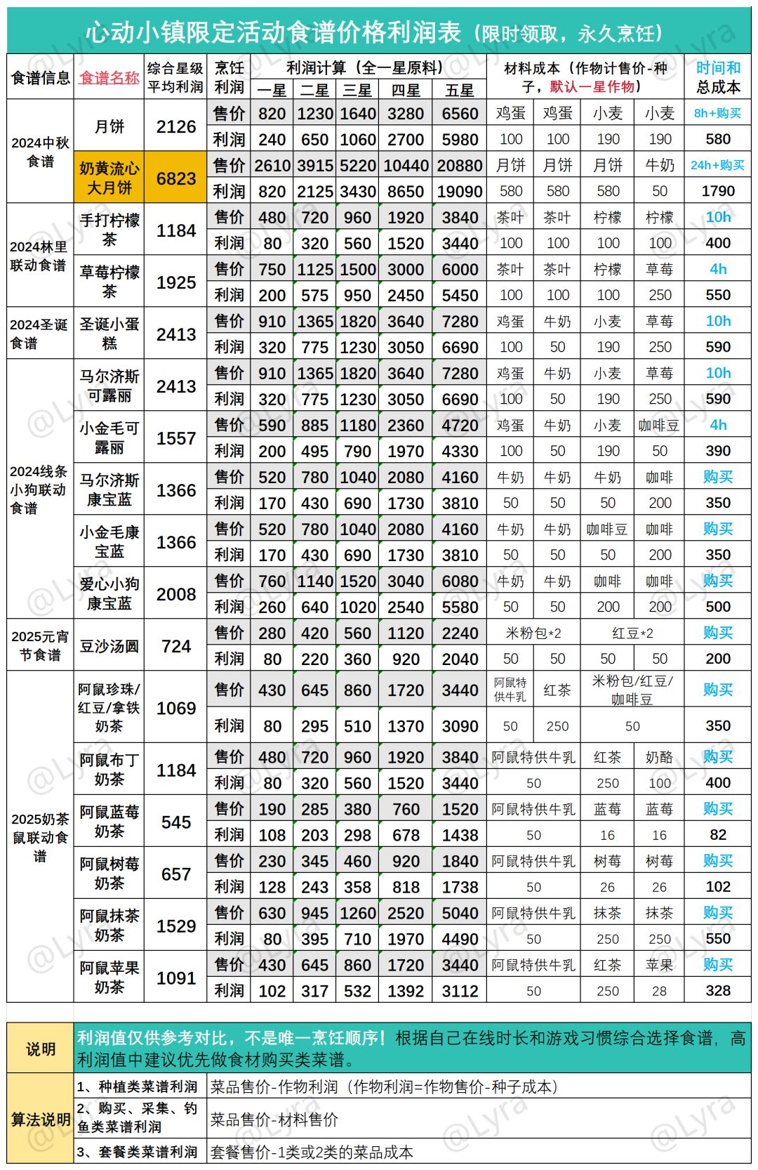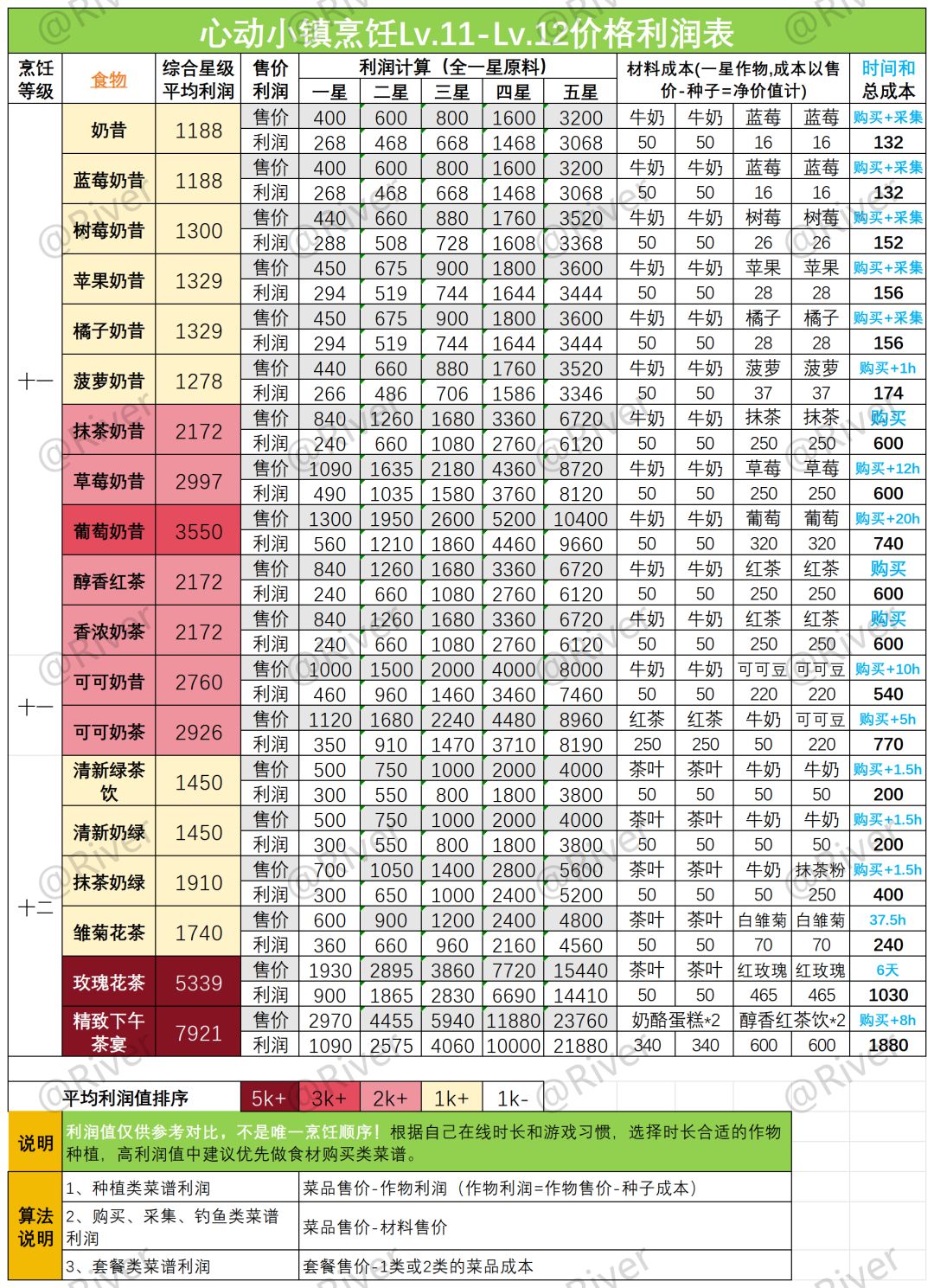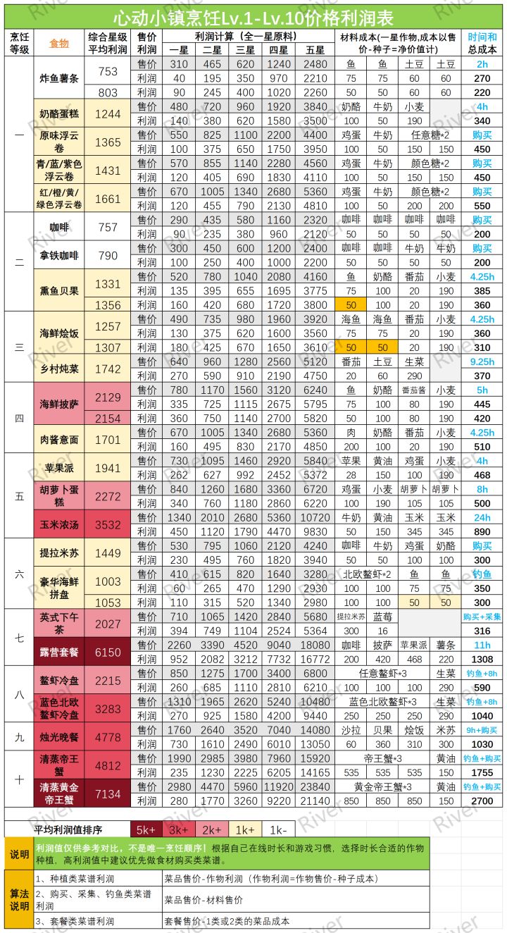 ‼️‼️声明:底部排序仅针对菜品出售的利润值,不是只能按这个顺序做,评论有时间成本争议,大家可以根据自己在线时长、游戏习惯、行动路径,结合表里蓝色字的时长综合选择菜谱。每个人在线时长不同,单位时间收益也无法统一,还请谅解。
