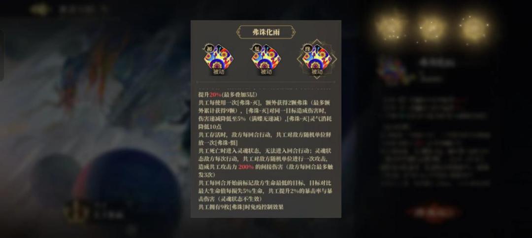 - 我方每有一名目标死亡,共工释放技能时每颗弗诛伤害提升20%(最多叠加5层)