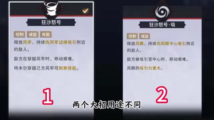 大招1可以制造一个风之牢笼,如果有人穿过边缘会被风沙压制,移动变慢且无法操作。