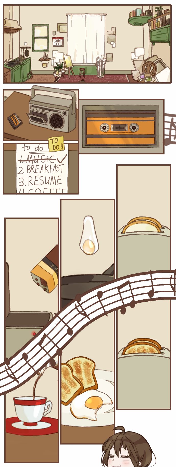 画了Amber每日晨起的场景!最初体验Steam上的demo时便被这温暖的清晨时光触动到了,小木屋、画架、咖啡机,轻松又惬意,于是决定以这个为灵感进行二次创作。原作画面就很棒,我在部分沿用原作镜头的同时,将精力更多地放在了分镜上。希望我能讲好这一小段晨间故事,希望我能将当时感知到的触动通过这个小条漫传递给大家