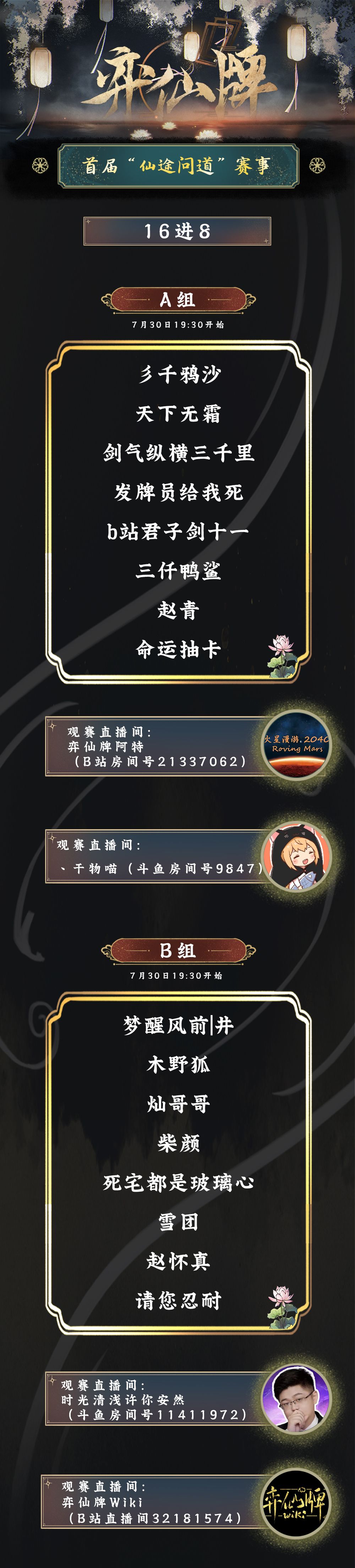 道友们好!“仙途问道”赛事16进8淘汰赛将会在今晚7:30打响!