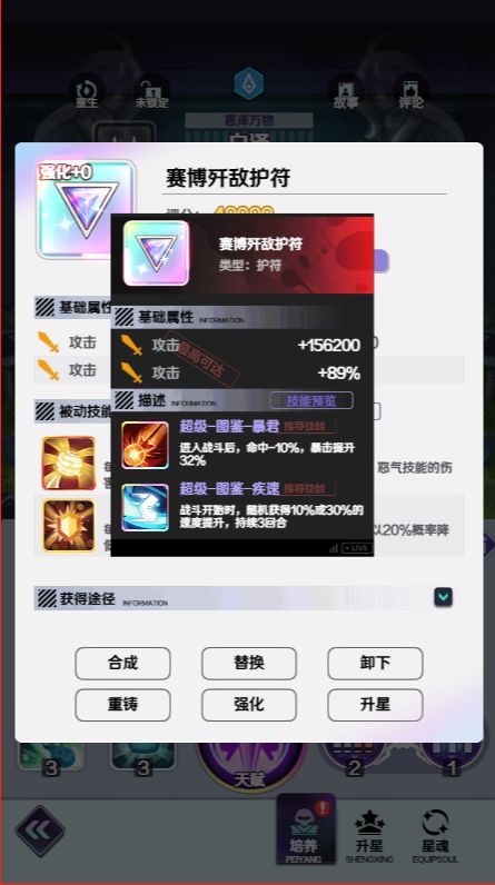 护符合成:每个品质的护符均可以通过合成升至更高品质,直至成为最高的彩色品质赛博护符;