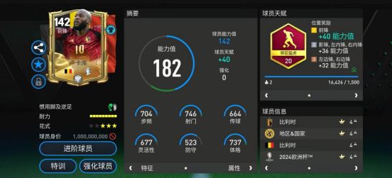 天赋方面,卢卡库配备了游戏中最热门的前锋天赋禁区猛虎,这项天赋加成了他的射门、射门力量、抢点、盘带、力量五项数据,这五项数据的加成让卢卡库终结者的作用进一步放大。在没有天赋加成的数据中,卢卡库的冲刺速度、加速、控球、弧线、凌空抽射等数据也都非常高,在同级别球员中他的数据强度不落下风。