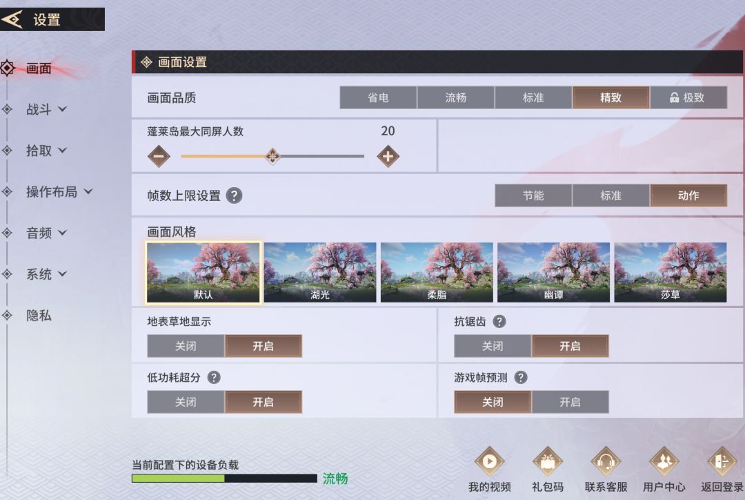 首先,各位英雄打开画面设置看到的预设默认画质即为最满足设备低功耗流畅游玩的画质选项。