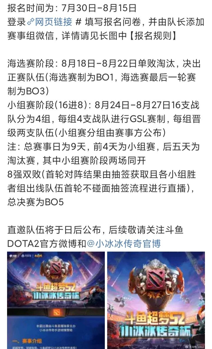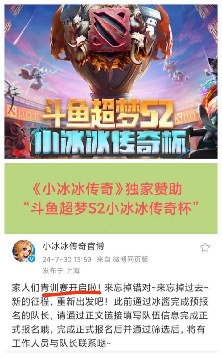 7/30号,《小冰冰传奇》出资赞助的“斗鱼超梦S2小冰冰传奇杯”开始报名啦❗❗❗