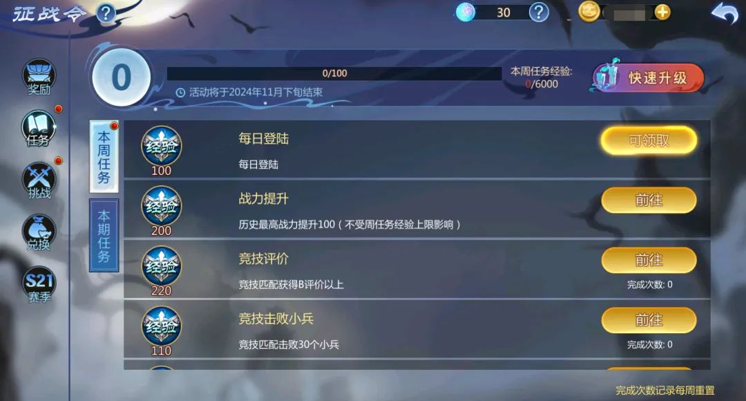 征战令任务共有两种:本周任务、本期任务。本周任务将在每周一0点更新,本期任务获得的征战令经验不受每周任务经验上限影响。