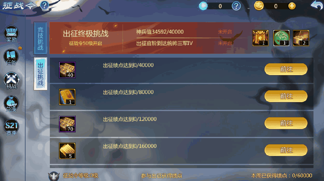出征终极挑战:达成对应的出征绩点要求,可获得大量荣耀军功、称号*指点江山、元神徽章自选礼包、各种珍贵道具奖励!