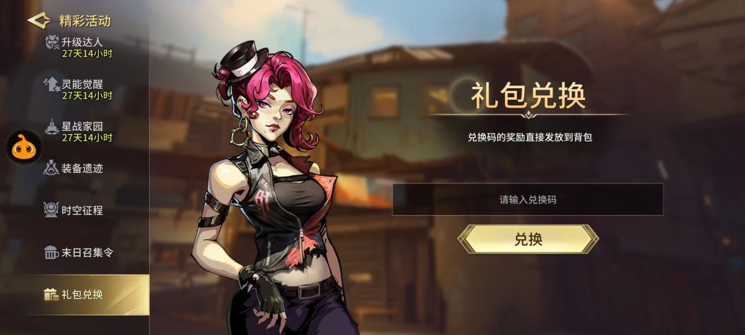 主界面左侧精彩活动,往下拉最后就是填写末日召集令码1078293和礼包码的位置。