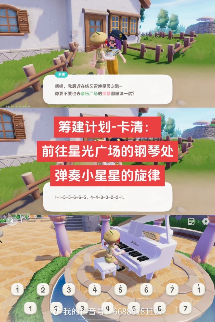 🎹筹建任务-卡清:接到任务后,前往星光广场的钢琴处,使用钢琴弹奏小星星的旋律“1155665,4433221”,完成后返回和卡清对话即可完成任务。