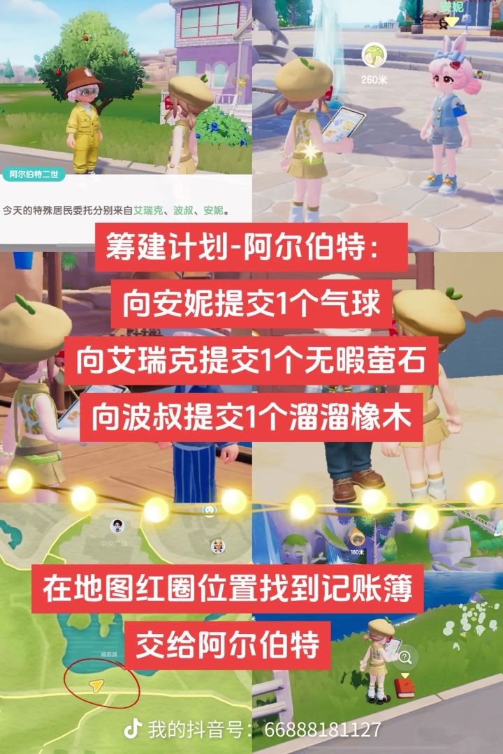 🧑🧑🧒🧒筹建任务-阿尔伯特:接到阿尔任务后,需要完成其他3位NPC的额外委托。(安妮:提交1个气球🎈 艾瑞克:提交1个无暇萤石🌟 波叔:提交1个溜溜橡木🌲)完成3个额外委托后回去找到阿尔伯特,继续对话后,来到地图上我用红圈标记的位置处,可以找到记账簿,将记账簿交给阿尔伯特即可完成全部任务。