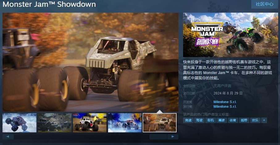 今日(7月11日),越野街机赛车游戏《Monster Jam™ Showdown》Steam页面上线,该作预定2024年8月29日发售,支持简繁体中文,感兴趣的玩家可以点击此处进入商店页面。