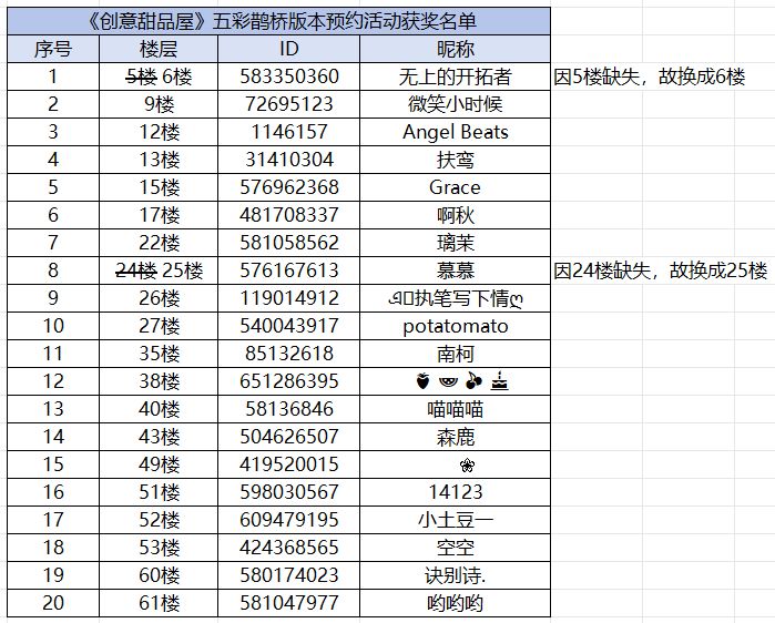 五彩鹊桥新版本预约活动开奖啦,在此管家先向店长大大们致歉,由于甜品屋任务较多,这次开奖才姗姗来迟,那么也是非常感谢店长大大们积极参与哇~