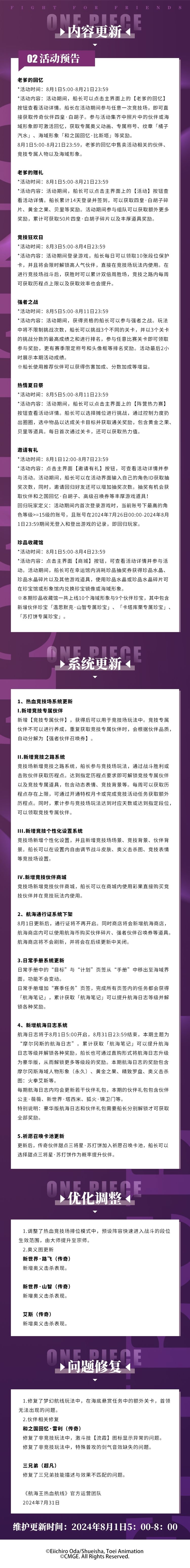为了各位船长旅途更丰富、航行更平稳,《航海王热血航线》将于2024年8月1日5:00-8:00进行维护更新,预计停服维护3小时(可能根据实际情况提前或延后),届时将无法登录游戏,请大家互相转告并提前下线,避免不必要的损失。
