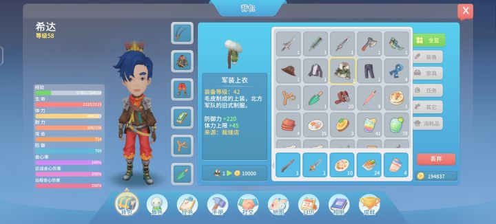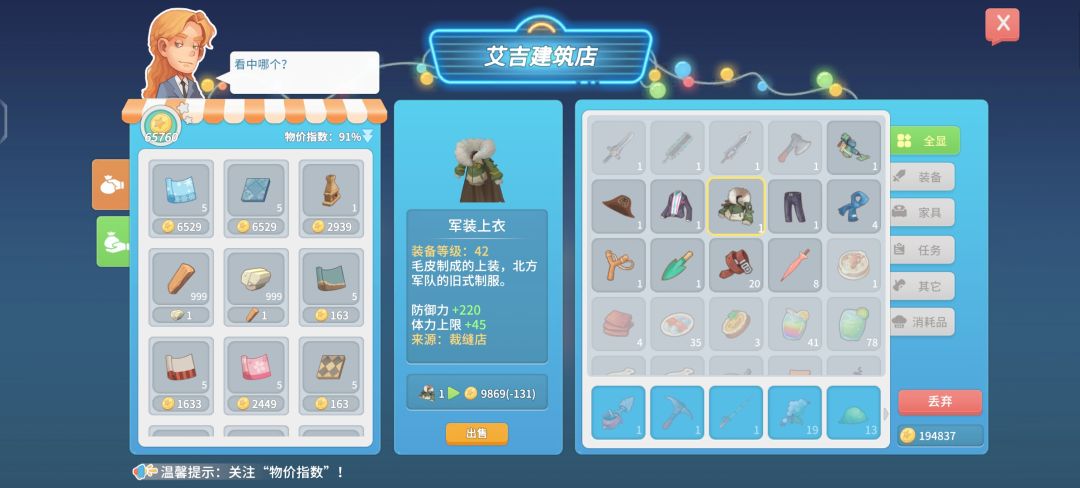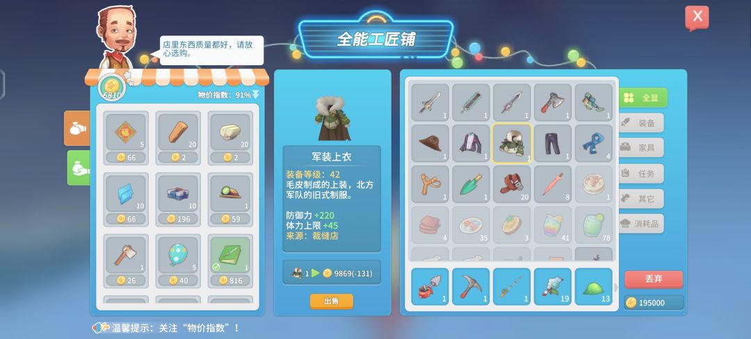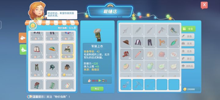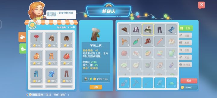 赚钱毕竟快的一个方法,在缝纫店那里可以用40柔性纤维可以买到军装上衣和裤子,柔性纤维大多数精英怪都会掉落(3个~5个)建议拉一下增加怪物掉落的天赋,拉好卡萝的关系最少30个柔性纤维换一件军装上衣或军装裤子(达到挚友关系打7.5折)军装衣服在物价100%的情况下可以卖到1W(建议物价在100%以上在卖比较实惠)可以卖的地方有缝纫店,全能工匠铺,圆桌餐厅,艾吉建筑店。