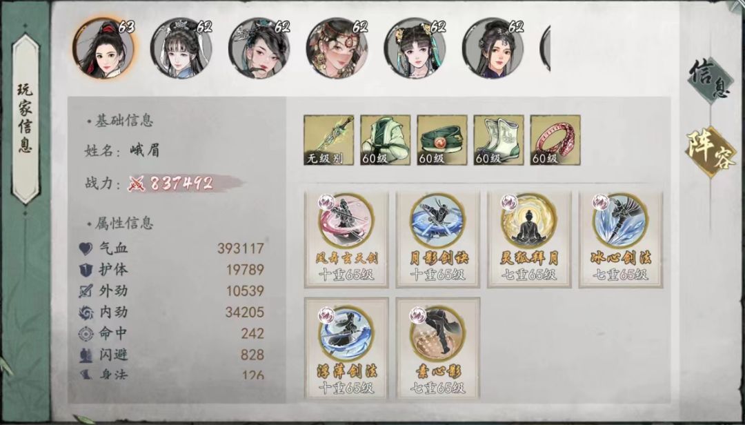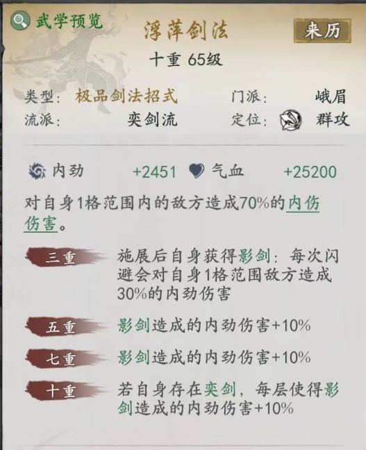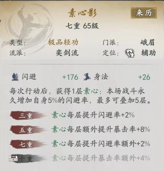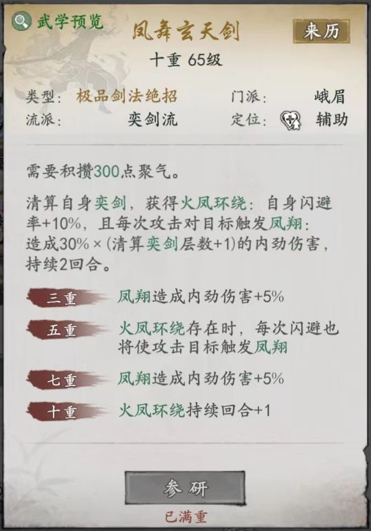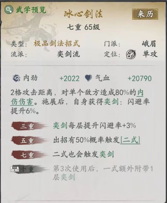 峨眉分两个流派,以闪避为核心的输出奕剑流和以减益治疗连结流,减益治疗连结流没咋看到有人玩,但是最近比较火的杂配版输出连结流,和峨眉橙武镇派搭不上边,五弦针算是利好了其他门派,这篇主要讲我玩的孙子奕剑流,门槛不算低,武学围绕着给主角增加闪避率的buff为主,输出主要看招式添加的奕buff被绝招清算的层数,先看一下常用的武学。