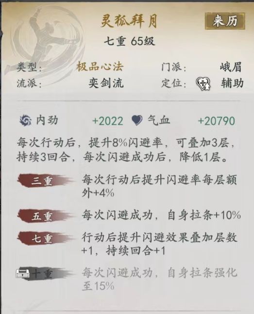 ②橙武心法-灵狐拜月:“狐”buff,主角每次行动叠加一层闪避,但是每成功闪避一次,就会消耗掉一层闪避,我很少叠加过两层以上的这个buff,开局月影跳进人群,哪怕是开局闪避率再低,前两回合闪避一两次还是有的,所以这心法根本就是个鸡肋,根本叠不高,尤其是后面你其他叠闪避招式越接近十重,或者你战斗后期轻功叠满5层,闪避上来了,这心法跟开玩笑一样,战斗中心法的狐buff就露一下,接着就没了,那个拉条也只是在本回合内拉条,而且条件竟然是成功闪避,才能拉条,我特么都被对面先手攻击了,我还拉什么条!
