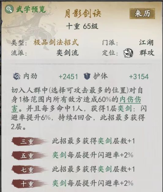 ⑤橙武招式-月影剑诀:“奕”buff,这个放在第一个招式,切过去,1格范围有2-3个敌人的话,开局就有一部分闪避率。算是奕剑流的核心招式。