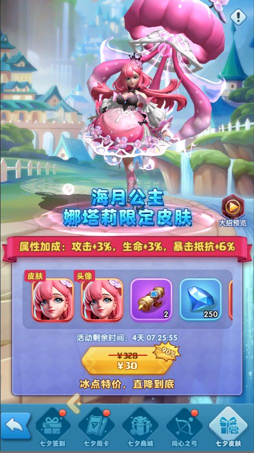 活动期间,开放娜塔莉-海月公主皮肤的购买。