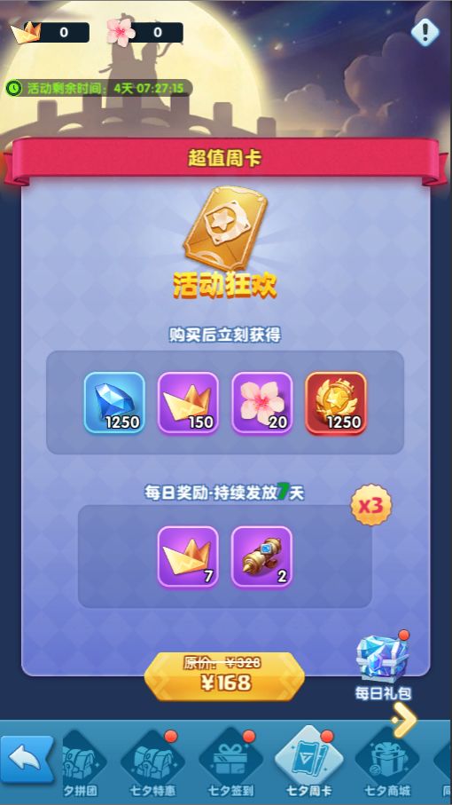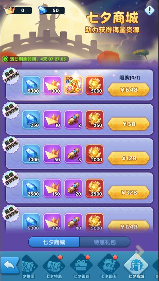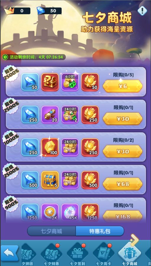 活动期间,开放七夕礼包和特惠礼包的购买。