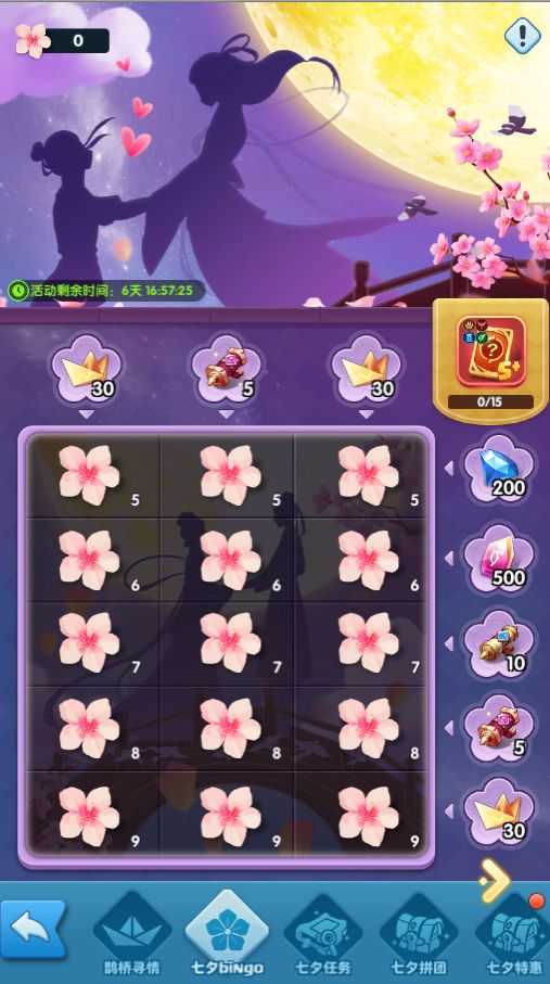活动期间,旅行者可以通过完成七夕任务获得桃花,使用桃花翻牌解锁获得卓越阵营卷轴、进阶石等多种奖励!完成bingo,还可获得四系S+英雄自选卡哦~