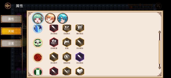 龙樱的生命、攻击属性直接影响到关卡通过数,生命成长和掠夺、攻击成长和掠夺、召唤物加成、赌狗有就给龙樱,技能可以选择熊猫类召唤物技能,以及共进退、生命光环、攻击光环类属性加成技能。