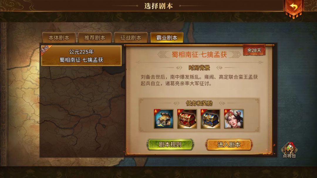 霸业剧本活动『蜀相南征·七擒孟获』已经正式与大家见面,大家可以通过 开始新剧本-霸业剧本 或点击治所内图标 前往参与噢~